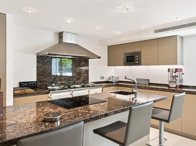 The modern, well-equipped kitchen showcases taupe cabinetry, dark stone countertops, and an island cooktop. An adjacent dining space opens to the gardens, while a separate lounge with exposed wood beams, a bar, and a stone fireplace connects seamlessly to the terrace and pool area. These interiors combine contemporary finishes with classic details, providing both comfort and functionality.