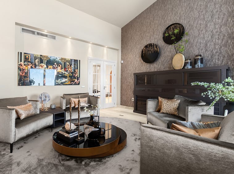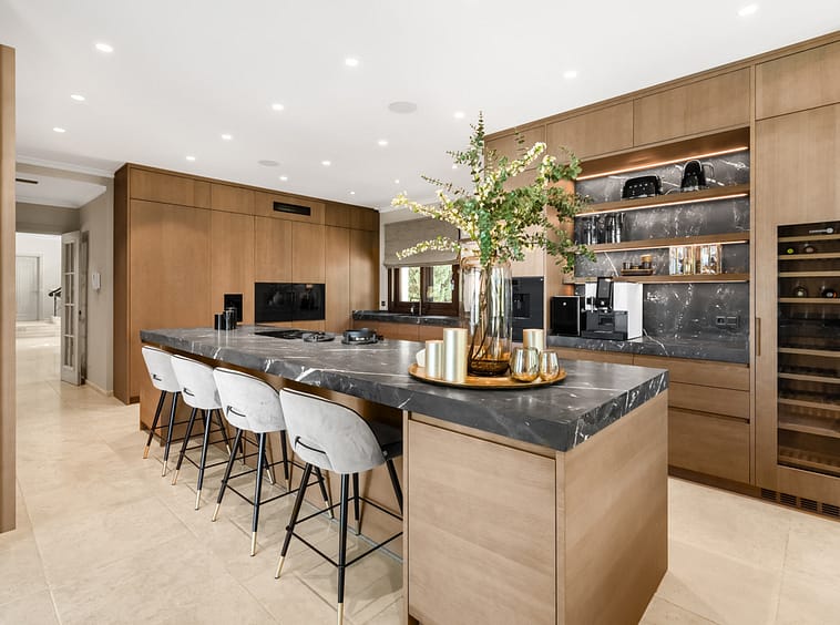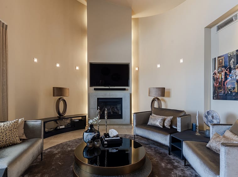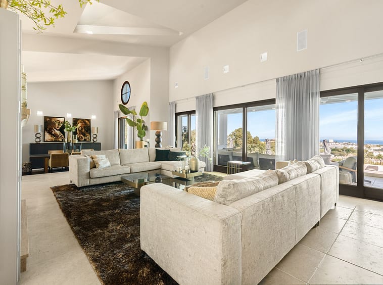 The interior of the home is equally impressive, with the main living room showcasing vaulted ceilings that create a sense of grandeur. A spacious dining area and a second living room provide ideal spaces for both formal and casual gatherings. The kitchen is equipped with high-end Gaggenau appliances, ideal for culinary enthusiasts. Stepping outside, the villa opens to an expansive terrace with a stylish lounge area, seamlessly connecting to the heated swimming pool. The south-facing orientation ensures an abundance of natural light throughout the day. This stunning villa also features a beautiful barbecue area, perfect for outdoor dining and entertaining while enjoying the spectacular views.
