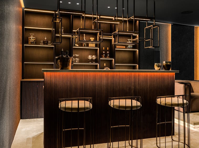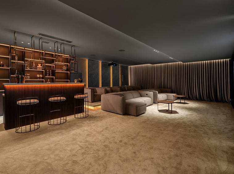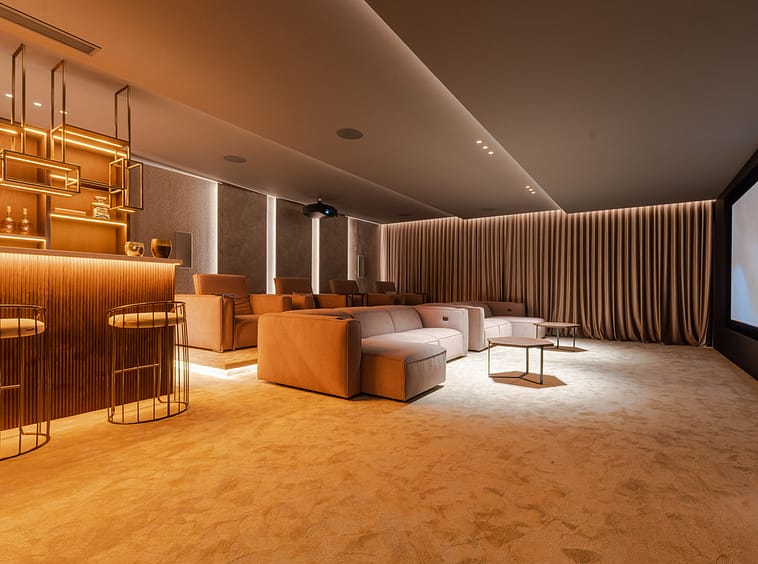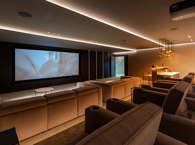 The lower floor offers an extraordinary luxury cinema room, a chic bar perfect for entertaining, a fully equipped Eleiko gym, a rejuvenating sauna, a private office for ultimate productivity, two additional guest bedrooms with en-suite bathrooms, and an expansive garage offering space for five cars, all designed with the finest attention to detail.