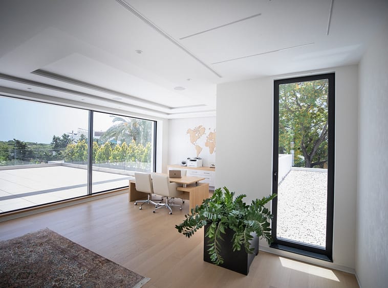A sculptural staircase leads to the upper floor, where a guest suite with an adjoining bathroom, an office, a dressing room, and access to the terraces await, providing a private retreat for guests or residents seeking a quiet workspace. The basement is designed for functionality and entertainment, offering a spacious garage with room for up to six cars, as well as utility and storage spaces. Entertainment rooms in the basement expand options for leisure, making it the perfect space for gatherings and personal enjoyment.