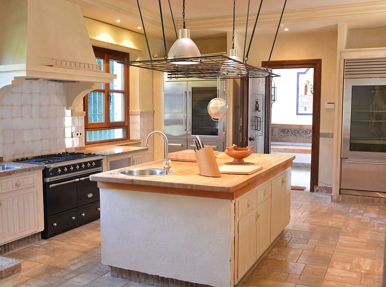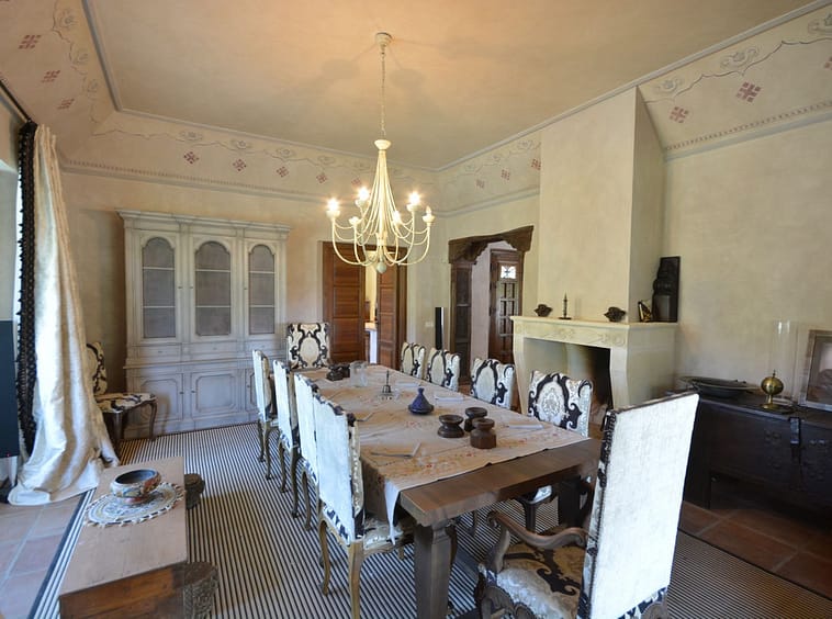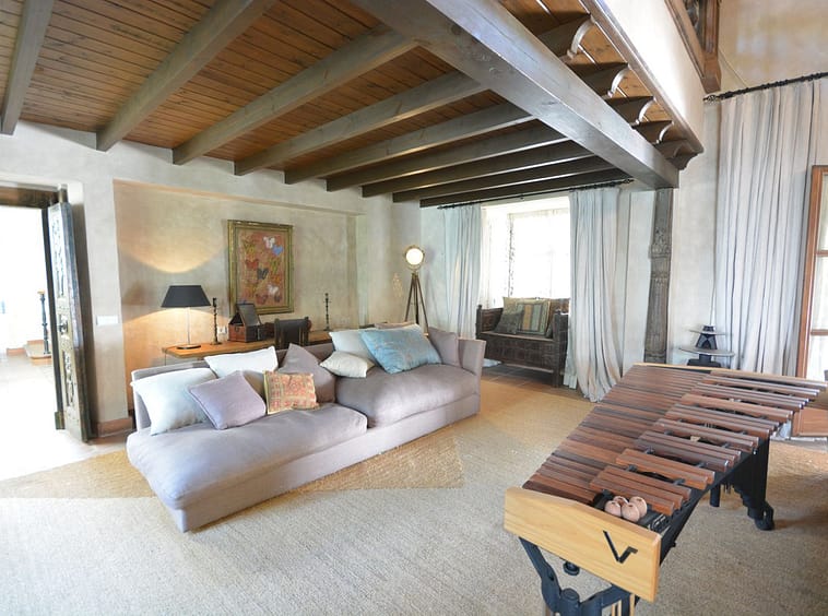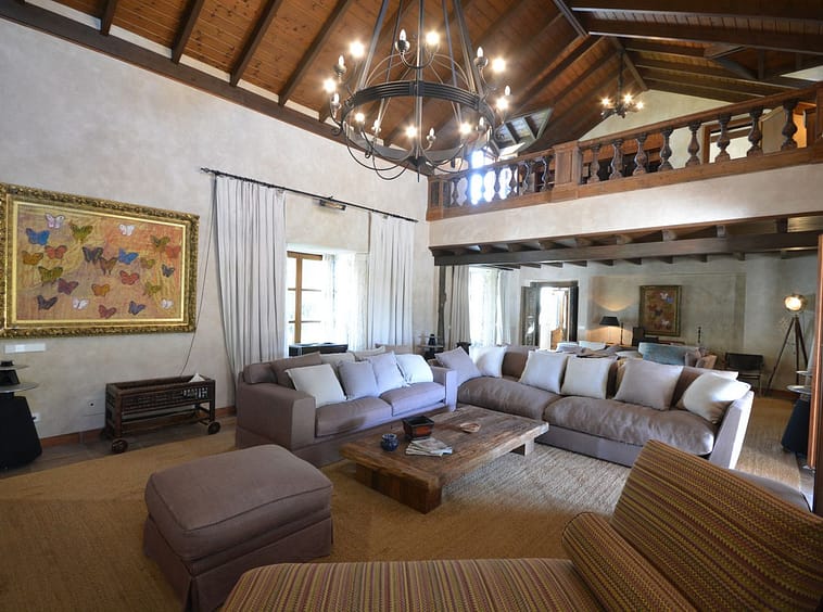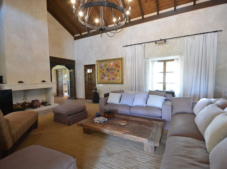 The actual distribution has, on the ground level: entrance gardened patios with water features and ancient olive trees, entrance hall with really high ceiling, wooden beams and a majestic staircase that leads up to a gorgeous master bedroom, dressing room and bathroom, plus like a sitting area overlooking the large living room. There is also a very spacious cinema room, a large dinning room with fire place and a large kitchen next to it. On the other side of the hall there are another three double bedroom suites. All this area access a large covered and open terrace which overlooks the garden, pool and forest. This is where the barbeque and outdoor dinning is.