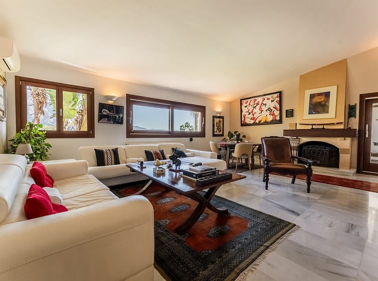 The second level opens into a spacious main lounge leading to a covered terrace with seating and barbecue area, overlooking the garden, heated pool, surrounding mountains and the Marbella skyline.