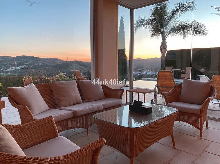 The heart of the home is a 162 m² open-plan living space combining kitchen, dining, and lounge areas centered around a wood-burning fireplace. Large sliding doors open onto an expansive terrace with multiple areas for relaxing, dining, and entertaining, all set against the spectacular backdrop of Mijas Golf.
