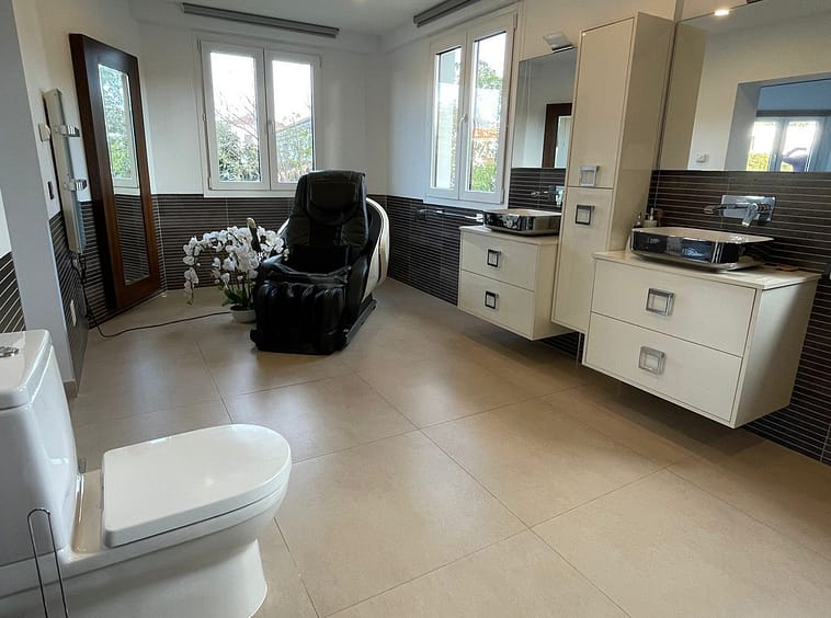 New triple glazed windows with climate glass throughout. Spacious master bedroom with Villeroy and Boch Aveo New generation Bath and China.Large south facing pool with large terraces and lawned garden .Garage for 2 cars , parking for 5 cars .Very private ,totally secure, 500 meters from the beach .